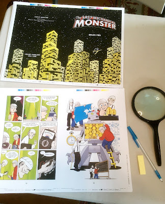 I gather that the industry is moving toward digital (PDF) proofs, which I think are useless. Especially for a graphic novel, you need to see how the images and ink will look on the page, which is very different from how they look on a monitor. You need to inspect the quality of the publishing process itself--are the colors in register (lined up right), are there flecks and specks on the printing plate? A PDF doesn't tell you any of that. As it is, I only got physical proofs for 12 spreads, or 24 pages, so we picked pages that might reveal problems or answer questions, e.g., how does my white lettering on a black background look (the answer: just fine!).