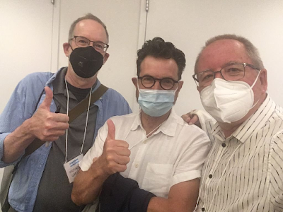 Physician Michael Green, British physician and graphic novelist Ian Williams, and a guy without an MD. Ian, with MK, is the other originator of graphic medicine and the inventor of the term. Not surprisingly for a conference with a lot of doctors and nurses, the event is extremely COVID-conscious. Masks always on indoors, and often on outdoors as well.