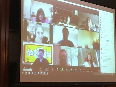 The face of conferencing in the modern era. Many, many people participated via Zoom, which introduced some tech problems, especially when presentations had to be shared and so forth. There were some hiccups but on the whole I think it went well. But I really took this photo because the guy at lower left used a page from my book as his digital background, and I was honored.