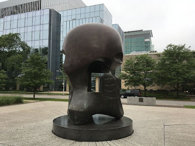 I made a little pilgrimage to this statue commemorating the University of Chicago's role in the Nuclear Era. Near this spot in 1942, Enrico Fermi and his team carried out what was surely one of the most reckless and dangerous scientific experiments in history by piling a heap of uranium-laced graphite bricks under the stands of a football stadium, making the world's first nuclear reactor and potential dirty bomb that could have wiped out half of Chicago. It didn't, so 25 years later they built a monument to it.
