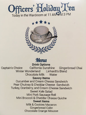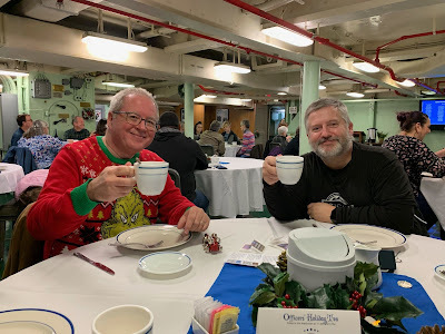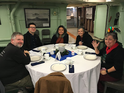 Festive!Our daughter Laura is the XO (Executive Officer) of the USS Hornet Sea, Air and Space Museum in Alameda, Calif., and a few times a year puts on an Officers' Tea to raise money to support her museum's Collections and Exhibitions Dept., always with the help of her sister Robin and a couple of hardy volunteers. We attend whenever we can--today with Karen's sister Cathy and (most of) her family. This was the first tea since the pandemic began and there were no signs of rust in the operation. Maybe 30 to 35 vaccinated folks, all of whom seemed to have a great time, with a second seating that's happening as I type this.