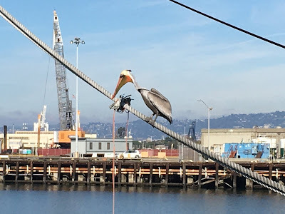 This pelican was feasting, just sitting on the Hornet's mooring lines and swooping down when a fish wandered beneath him. A fine sushi buffet.