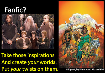 My talk. Here I'm showing my slide about ElfQuest with the creators of ElfQuest sitting in the second row. The coincidence did not go unremarked!My audience started small but grew as I spoke. A few people came up afterward with good, smart questions that I love to get. All in all, an extraordinary day.