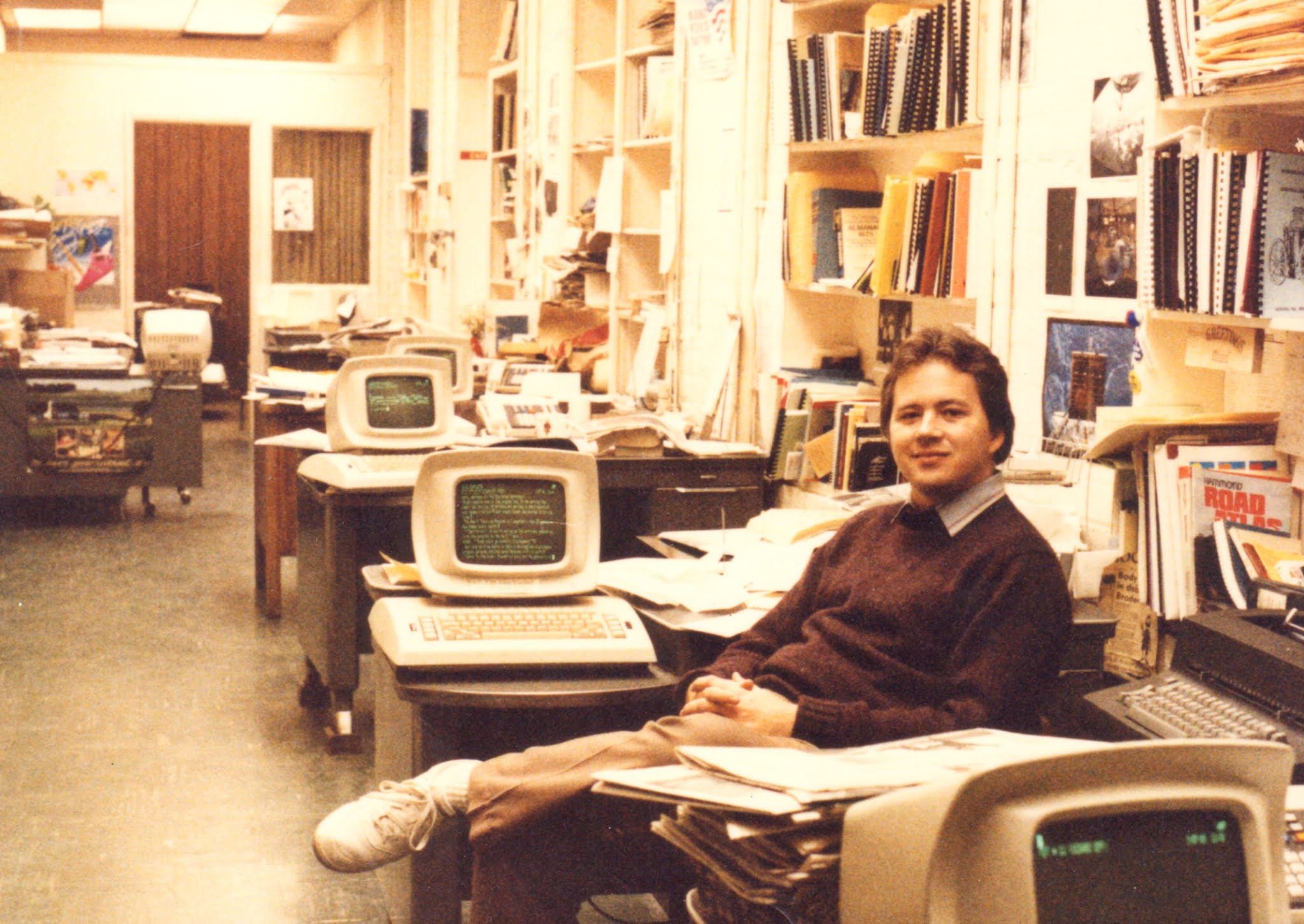 Attached is the only photo I have of me from around that time and sitting in the newsroom of the Woodland Daily Democrat, where you'll see the type of computer terminal I tossed into Mr. Paynton's trash can.