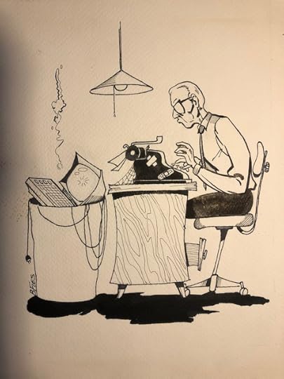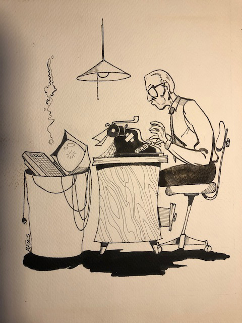 Along the way, my colleagues on the DD discovered that I could draw, and I did a lot of graphics and illustrations for the paper. After I'd been there a short time--maybe while I was still doing part-time sports, around 1983-1984--the DD put out a special edition to commemorate . . . something. I don't remember exactly what--it wasn't sent to subscribers, it was a run of the paper done just for the paper's owners and staff. There may have been a banquet to which I wasn't invited. My illustration celebrated the career of (Googling quickly) Charles Paynton, your relative I presume, who at that point had been at the DD for decades and did a column titled "Backtrailing" (again, Google tells me this, I didn't remember it). Maybe the event was his retirement from the paper.