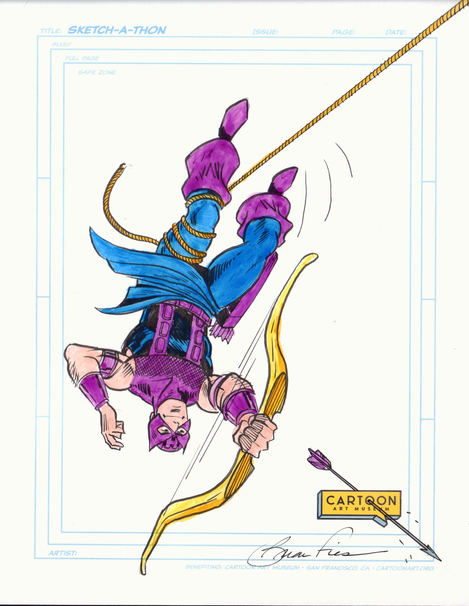Request: "Marvel Superhero." I emailed the customer to ask if he had a particular favorite, and he replied that he liked Hawkeye. Gather around, kids, while I show you what Hawkeye looked like in the comics before Jeremy Renner played him in the movies. I've always loved the character myself and have doodled him for decades. I was pretty proud that I thought of him shooting a bullseye through the "O" in "Cartoon."