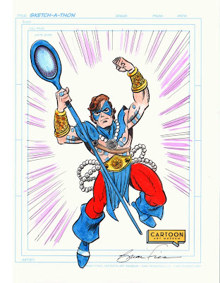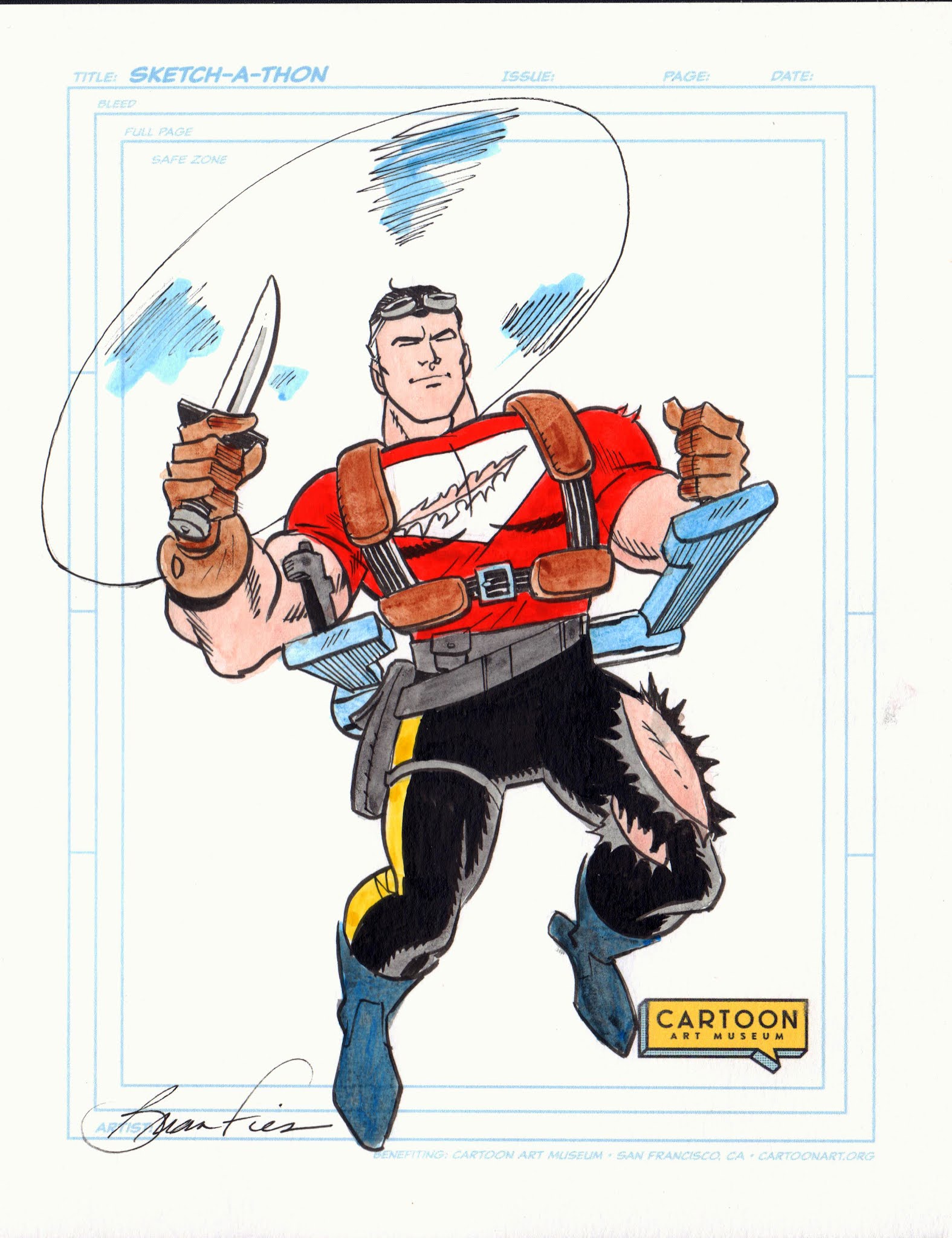 Request: "Tom Strong--battle worn, flying his jetpack please." The Tom Strong character is cool, kind of an old-school throwback "science hero" type, in the mold of my own Cap Crater. I couldn't find any reference of him flying a jetpack, but he often scoots around in a backpack-helicopter thing, so I went with that.