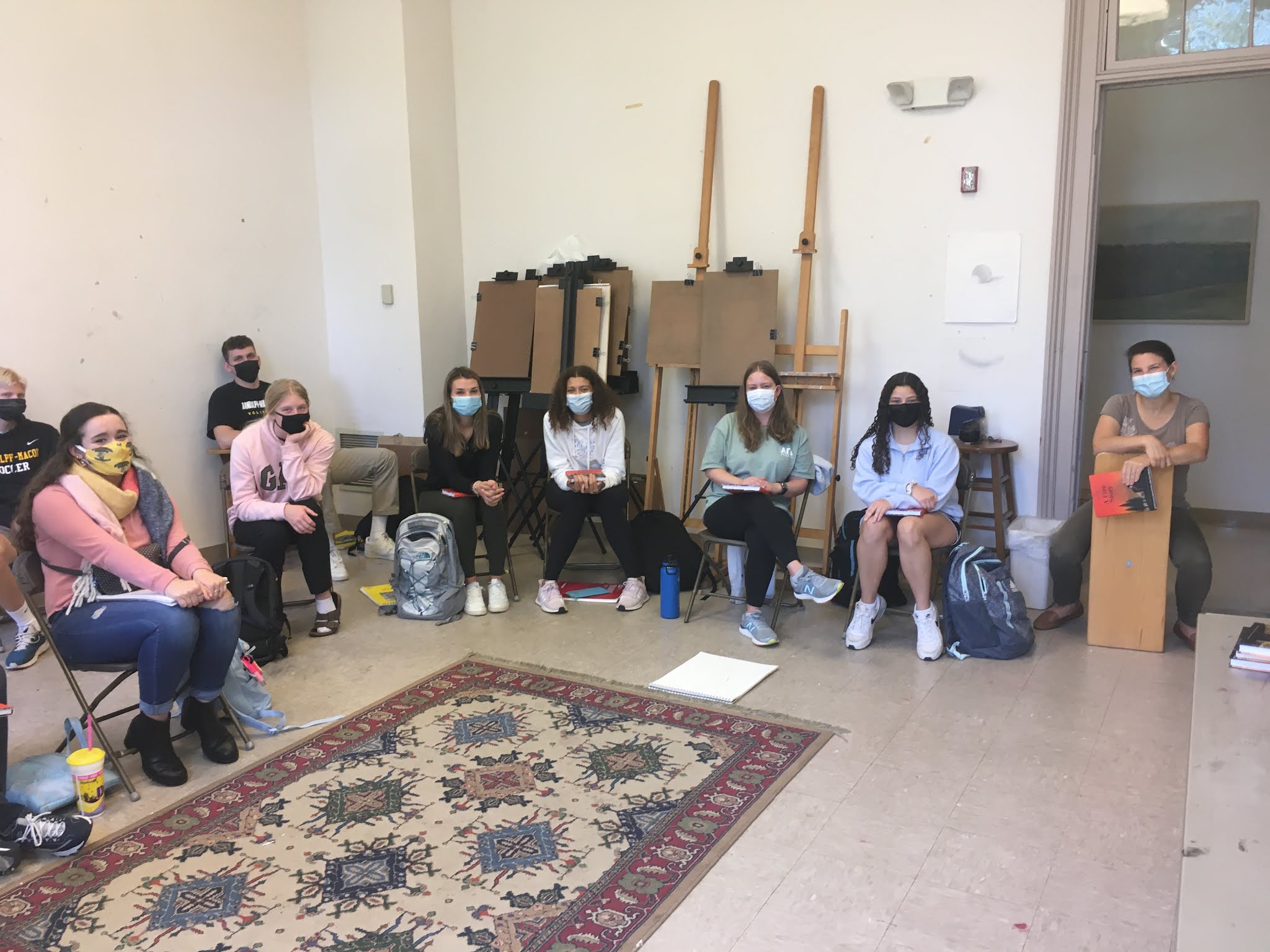 One of the classes I spoke with was Dr. Amber Peacock's course on "Discerning Learning and Achievement," which hit the resilience theme hard. Great students and teachers that I didn't get any pictures of. Instead, this was my second class, Drawing, with Prof. Kristen Payton, who's farthest to the right. This was about half the class, the other half was out of frame to the left, with the usual mix of students who are very serious about art and others who just want the general ed credit. A real nice conversation about art, intention, authenticity, finding your own style and voice, etc.