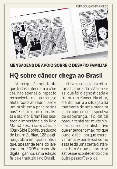 Very nice to wake up to on a Monday: the new Brazilian edition of "Mom's Cancer" is getting some press, which publisher DarkSide Books was kind enough to send me. I was going to write "good press" in that preceding sentence, but since I don't read Portuguese I don't actually know that. I may be mindlessly crowing about the worst reviews of my life. If so, please don't tell me.