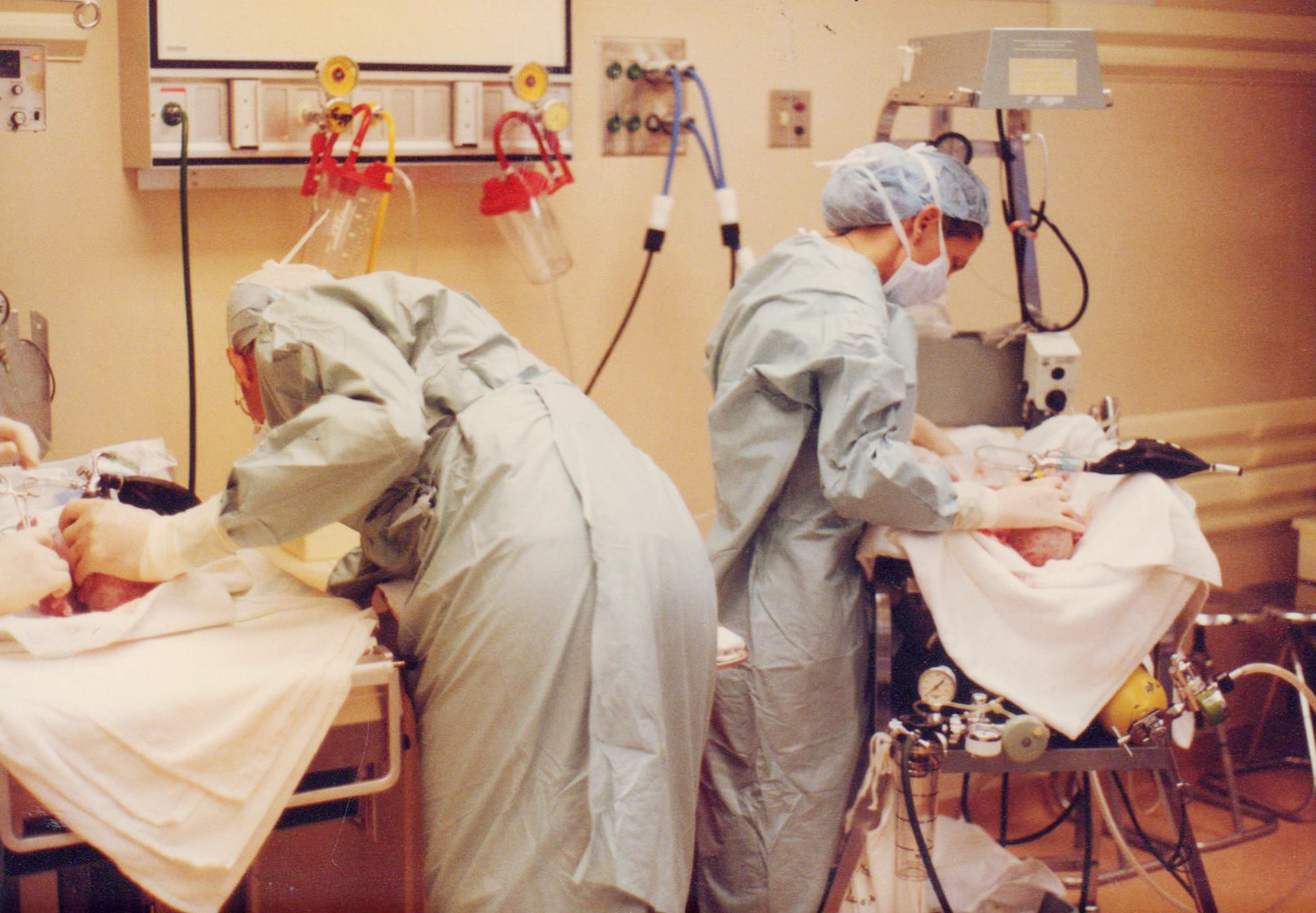 This is the very first photo I ever took of both of them together, moments after their births. There would follow hundreds of other photos of them together, but this was the first. You can see their little bald heads; they eventually grew hair. They were a few weeks premature and weighed about 5 pounds. As I recall, each had her own dedicated nurse. They were basically healthy but spent a couple of days in neonatal incubators. Karen needed more recovery time than they did. A few decades earlier, probably none of them would have survived the pregnancy.