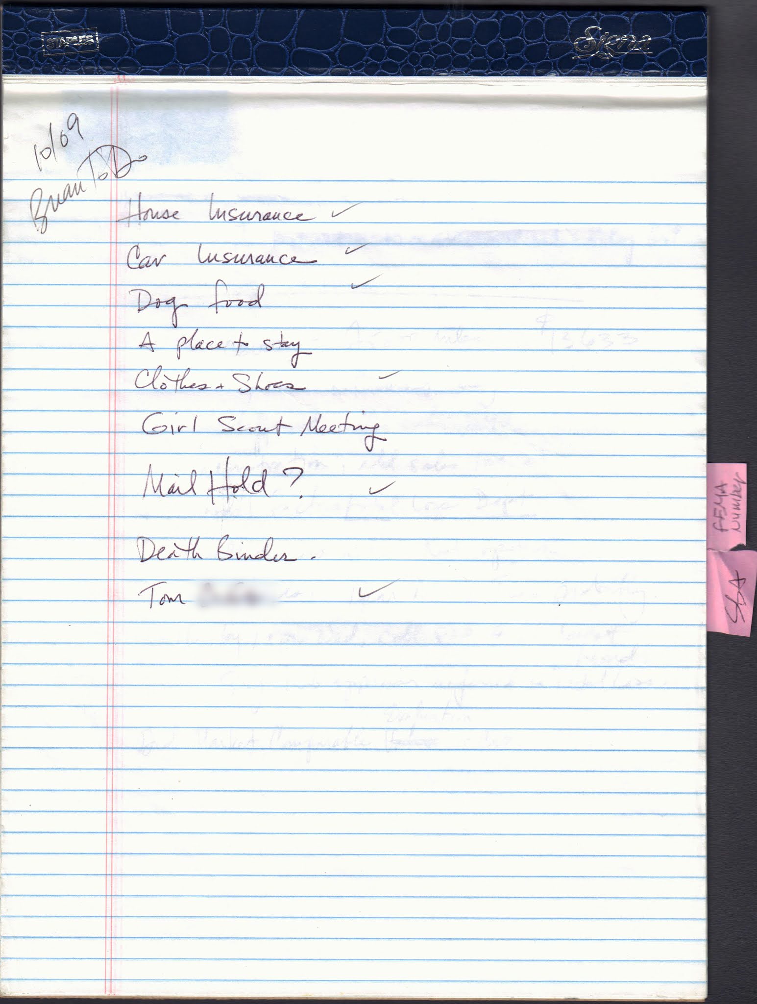 "Death binder" is what we called the file with our will and estate planning, which we needed to reconstruct. The "Tom" name blurred at the bottom is the financial guy who handles our retirement accounts. I figured he needed to know. (He didn't really.)