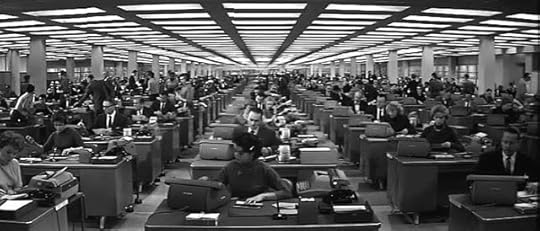 The movie's also a white-hot critique of mid-Century corporate culture, a pretty common theme of the time. Lemmon works at a desk in a grid of hundreds of identical people sitting at identical desks on an office floor that vanishes into infinity. They enter and exit elevators summoned and dispatched by stern women with clickers, like orca trainers at Sea World. In a few years, all those people's tasks will be taken over by computers, and it's easy to conclude the computers did them a favor.