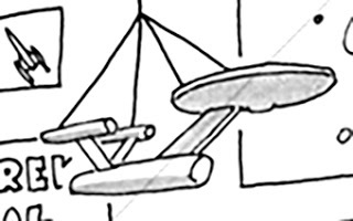 Here’s an example I cropped from an old “New Yorker” cartoon by Jack Ziegler (no need to show the whole thing; suffice to say the gag’s set in a sci-fi fan’s room). That’s the Enterprise, everybody knows it, and a child could draw it. Iconic.