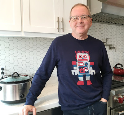 To inject a little color into the day, I am trying to wear the most colorful, gaudy shirts I own. Today it's rainy so I put on a robot sweater. I smile every time I catch it in a mirror.