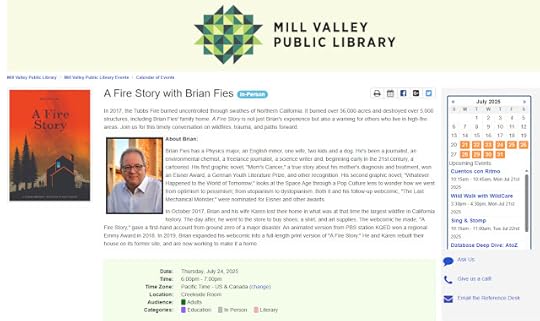 I had a good time talking A Fire Story at the Mill Valley Public Library last night. Got about three dozen people, which I think is a great turnout for a library talk on a Thursday evening.