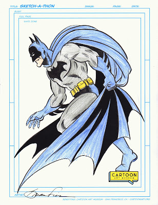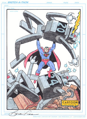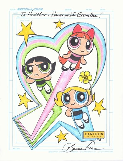 Heather asked for "Powerpuff Girls or artist's similar choice of (non-sexualized) female superhero." No alternative choice necessary because I love the Powerpuff Girls and have been drawing them since my daughters were little! The Powerpuff Girls are kind of like "Peanuts" characters in that their designs look very simple but you have to get them just right or they look completely wrong. Deceptively hard to draw, especially while trying to impart a little style of my own. These were all a hoot, and each stretched different art muscles. I don't otherwise do commissions, but I've always been happy to raise a few bucks for CAM, a fine institution of culture and scholarship. If you ever visit the San Francisco waterfront near Ghirardelli Square, drop in and tell 'em I sent you. They won't give you a discount or anything, but word might get back to me and it'd make my day.
