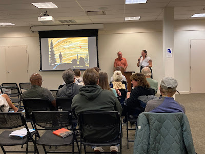 It was also an unusually interested and knowledgeable group, including a retired firefighter with 30 years' experience, a man in the fire prevention business, and a woman who helps evacuate horses from wildfires (a very specialized form of aid in its own). It was great to meet the sister of an old work friend. Librarian Jenn was an excellent host. Best of all, my wife Karen, our two daughters, and their friend Emily all came, and we had a fine dinner afterward. Even sold a few books!