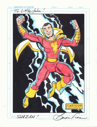 Little John requested "Captain Marvel (Original Big Red Cheese)". There have been many characters called Captain Marvel over the years, including the most recent played by Brie Larson, but this is the original real deal who sometimes goes by the name "Shazam!" (for complicated historical legal reasons). I had fun drawing the lightning.