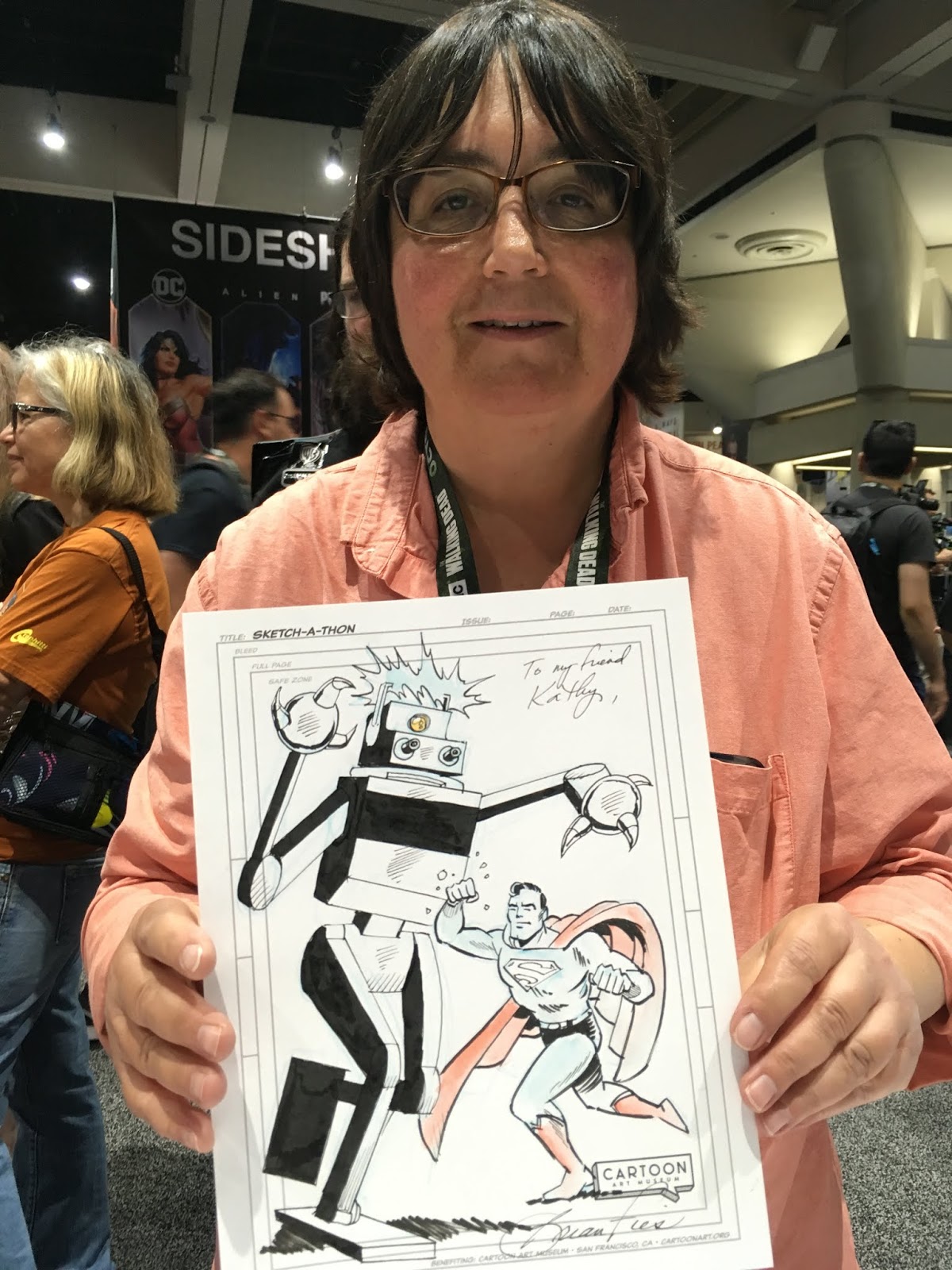 I drew for an hour to support the Cartoon Art Museum and its curator, my pal Andrew Farago. Two or three cartoonists took turns trying to draw whatever folks wanted in exchange for a donation to the museum. I did a few drawings I was actually pretty happy with, including this one for my friend and former comic book shop owner Kathy Bottarini. She said I could draw whatever I wanted and I knew she liked my Last Mechanical Monster webcomic, so I drew the epic throwdown that my enormous respect for copyright law (and enormous fear of DC Comics lawyers) prevented me from doing in my own story.