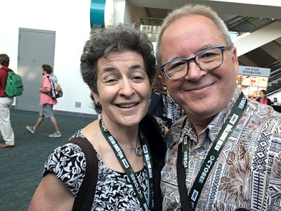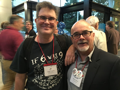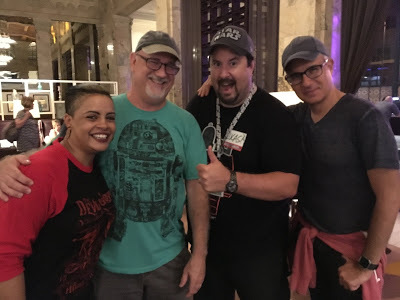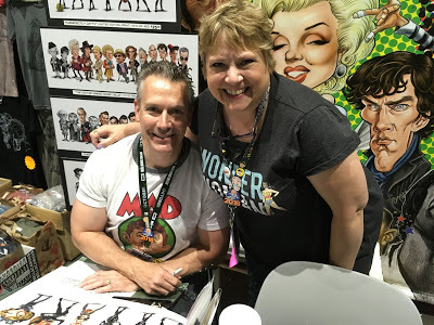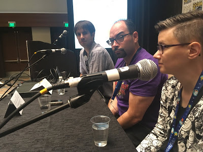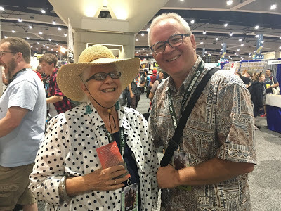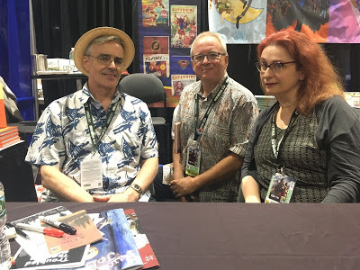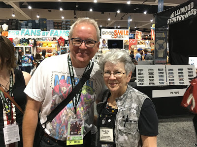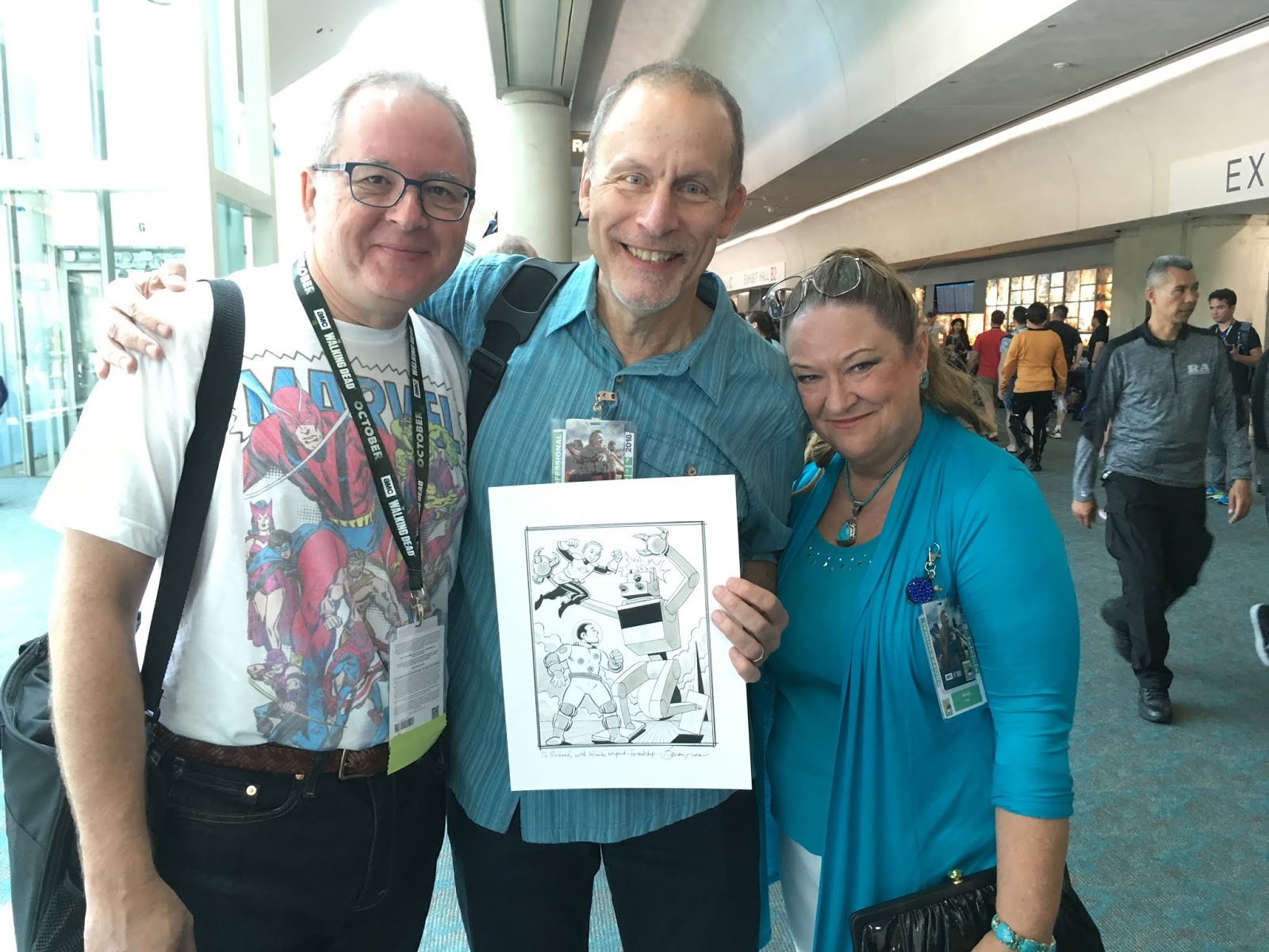 One of the first people I ran into was Richard Pini, who with his wife Wendy Pini has been doing the groundbreaking series ElfQuest for 40 years (!). They're the best. Richard has been especially kind and generous to me over the years, in ways I won't embarrass him by recounting, but trust me: I owe him a lot even though he'd insist I don't. So I made and brought a drawing for him, of my characters Cap Crater and the Cosmic Kid from Whatever Happened to the World of Tomorrow facing off against The Last Mechanical Monster at the 1939 World's Fair. I figured that'd be right in Richard's wheelhouse. I was right. I later had the pleasure of watching them receive the well-deserved love of their fans during their ElfQuest panel.