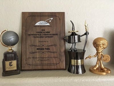 So Charlie and I did our panel and I thought it went very well and was almost over, when he pulled out boxes. Uh oh. Unknown to me, he'd conspired with a lot of people to replace various awards that were destroyed in the fire. My 2005 Eisner Award for Mom's Cancer. My 2009 Emme Award from the National Astronautical Society for Whatever Happened to the World of Tomorrow. To its right is the jaunty Inkpot Award, followed by Charlie's own contribution, the golden Bob Ross Award, which I take as a reminder to draw happy little clouds and trees every chance I get. And he says more replacements are coming.
