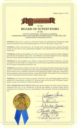 I received a very nice honor this afternoon, a Gold Resolution from the Sonoma County Board of Supervisors for my "contributions to the arts and literature" of the county, specifically "A Fire Story." It's a "key to the city" kinda thing except no keys exchanged hands. What was especially nice was that the supervisors genuinely appreciated my work and were very happy to recognize me for it. Smiles, handshakes, and quiet words of encouragement all around.