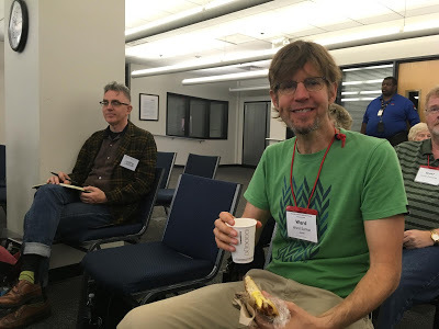 My friend, Bay Area cartoonist Jonathan Lemon (left), showed up on Saturday. Jonathan will be the subject of a major cartooning announcement soon; he wouldn't even tell me what it was, but remember: you didn't hear it here first. I sat between him and Ward Sutton, who does very smart work and gave what I thought was the best talk of the day on Friday.