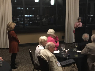 I thought this was one of the nicest moments of the whole weekend. Behind the lectern at right is Charis Jackson Barrios, winner of the Locher Prize for young aspiring cartoonists. She's done some good work for The Nib and other outlets, and warmly but pointedly noted that she was one of the few women or persons with brown skin in the room. She got an appreciative laugh calling them (us?) "the nicest group of old white guys" she'd ever met. What made this a great moment for me was the woman standing at left: Pulitzer Prize winner Ann Telnaes, beaming as happily and proudly as if Charis were her own daughter.
