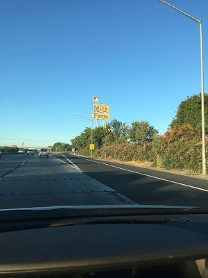 I took this picture driving home from Sacramento on Interstate 80 because the "Milk Farm" neon sign is visible from the roof of the UC Davis Physics Building about 5 miles away. I happen to know that because when I TAed astronomy labs in college, we'd aim a telescope at the sign and shine the light from its eyepiece through a diffraction grating, producing a nice neon spectrum that perfectly illustrated how astronomers know what stars are made of. So I'm just happy it's still there. For science.