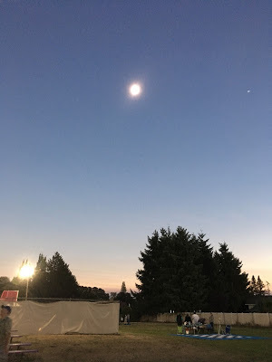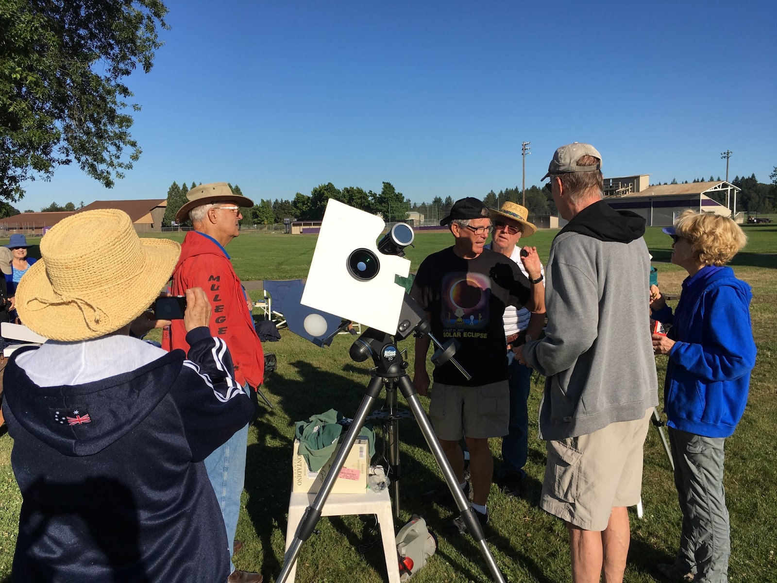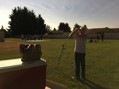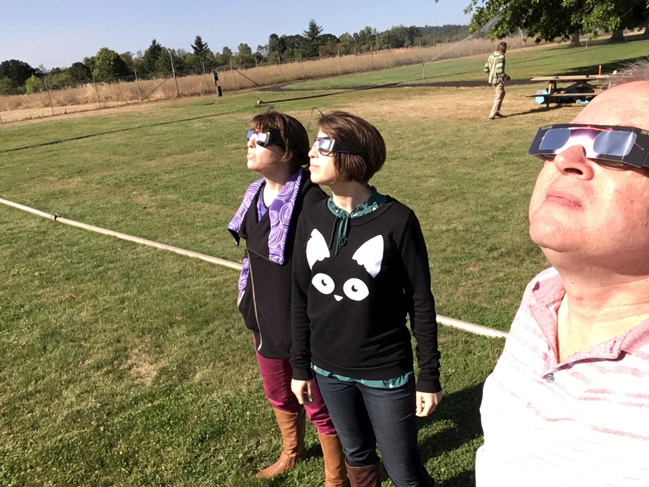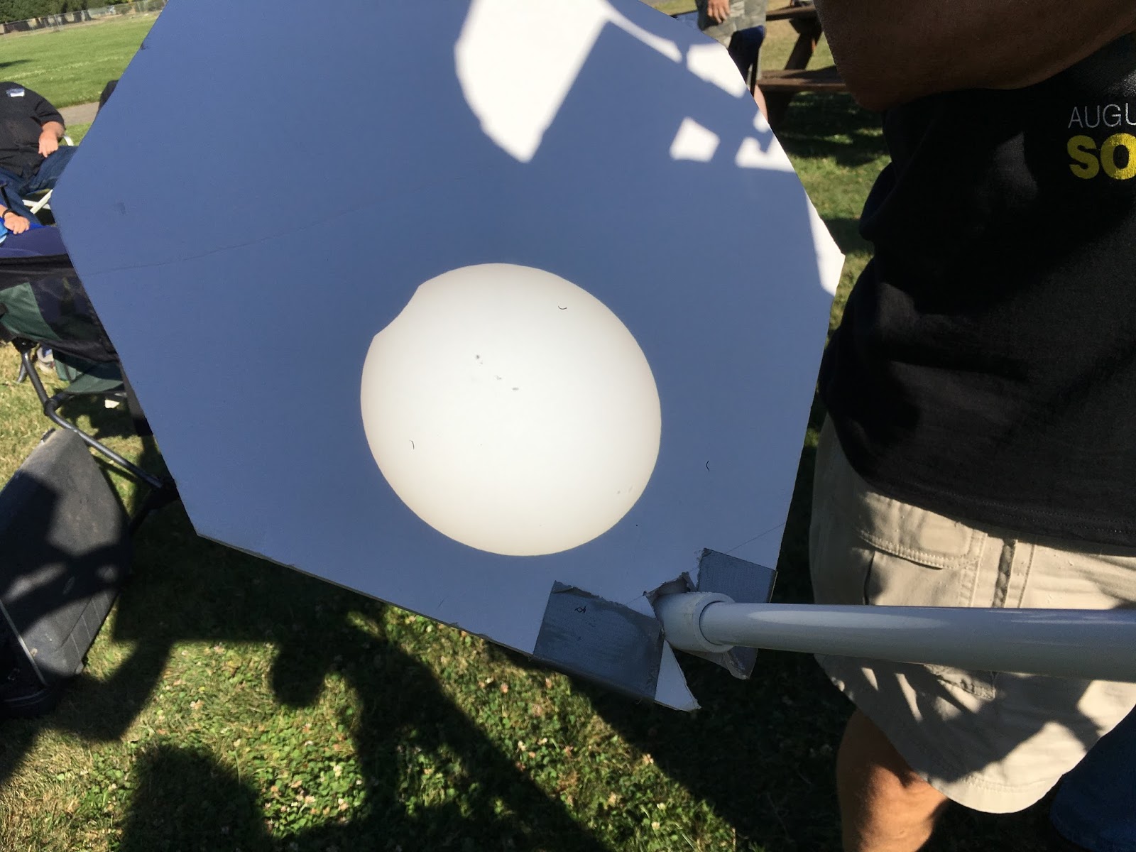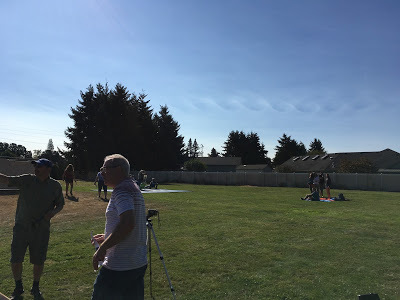 Our park companions were an almost stereotypical cross-section of folks you'd expect to turn out for an eclipse. Families with kids and lawn chairs and a solar pinhole projector made from a Pringles can. A group of amateur scientists who set out a fleet of telescopes and cameras. A hippie waiting to dance in the energy of a cosmic convergence. If we'd wanted to be alone there was plenty of space to move to another corner of the park, but these people were good company.