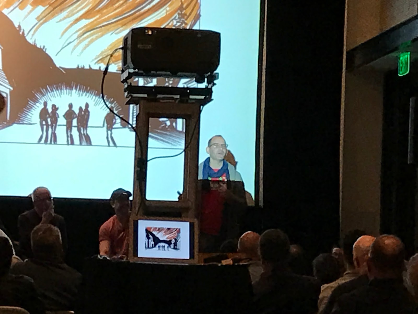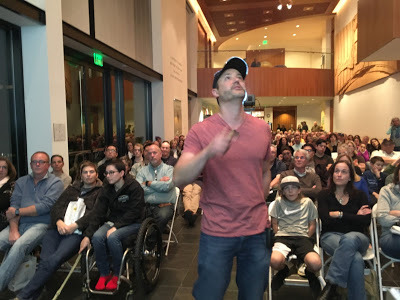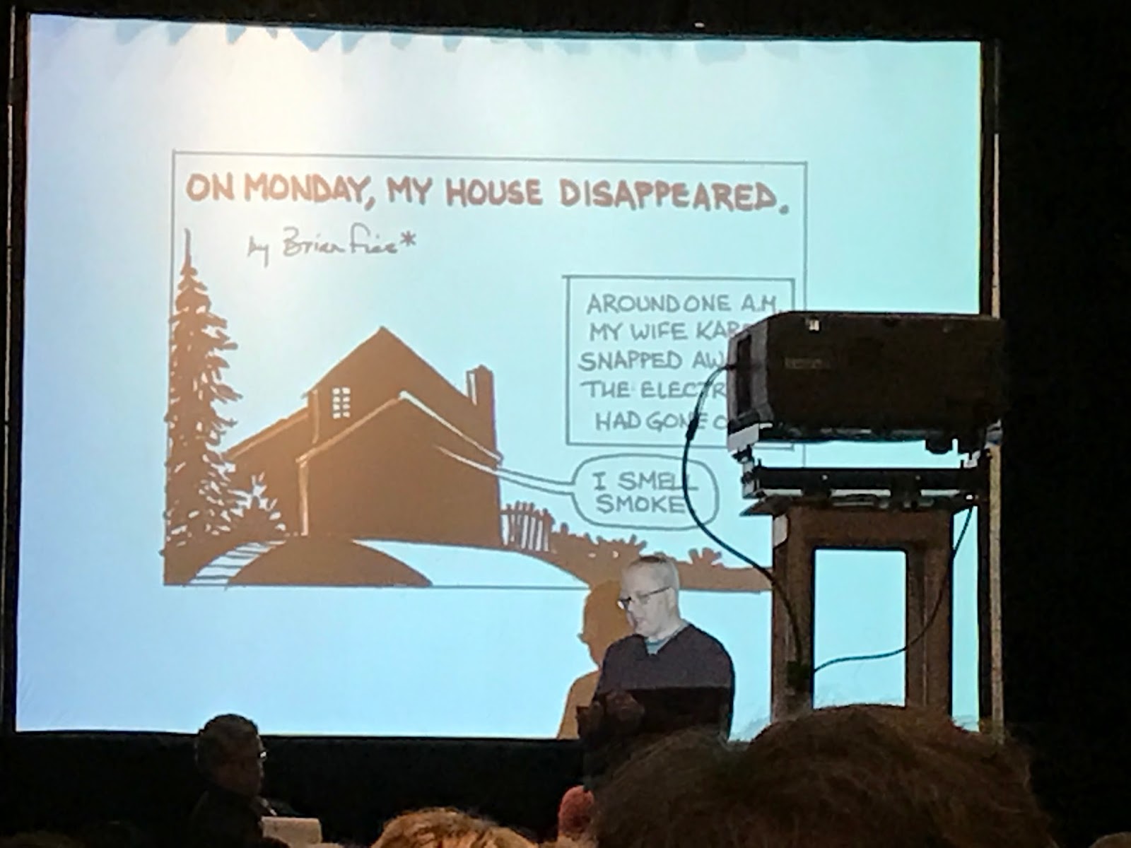 The view from my seat as Stephan reads from his comic strips, including more serious ones about Middle East violence and gun deaths. He genuinely choked up. I was touched. Note the full house.