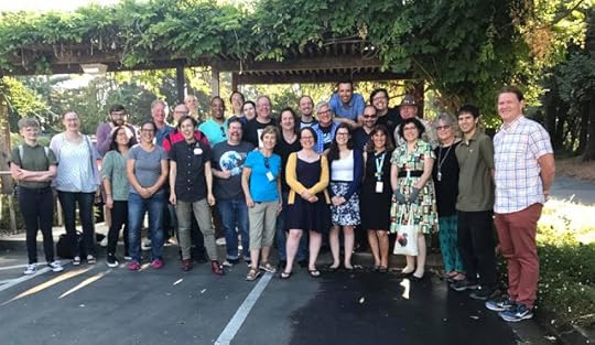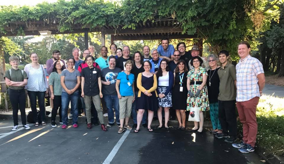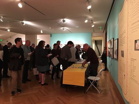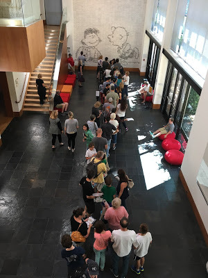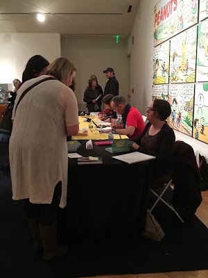 Cartoonists, Schulz Museum staff, and Schulz Studio staff gathered for a group photo at the end of the day. Somewhere in this photo are Svetlana Chmakova, Donna Almendrala, Maia Kobabe,Tom Beland, Denis St. John, Paige Braddock, Lex Fajardo, Andy Runton, museum education director Jessica Ruskin, Andrew Farago, Nathan Hale, Jeff Smith, Jeannie Schulz, Raina Telgemeier, and a lot of other fine people. Also me. Matching names with faces is left as an exercise for the reader.Saturday was a good day. I got to help the Charles M. Schulz Museum celebrate its 15th anniversary. One of the museum's secret weapons is the impressive amount of cartooning talent within an hour's drive (which includes San Francisco), both working for the Schulz Studio and doing their own things. Virtually all of them grew up loving and influenced by Peanuts, so when the museum calls they answer.