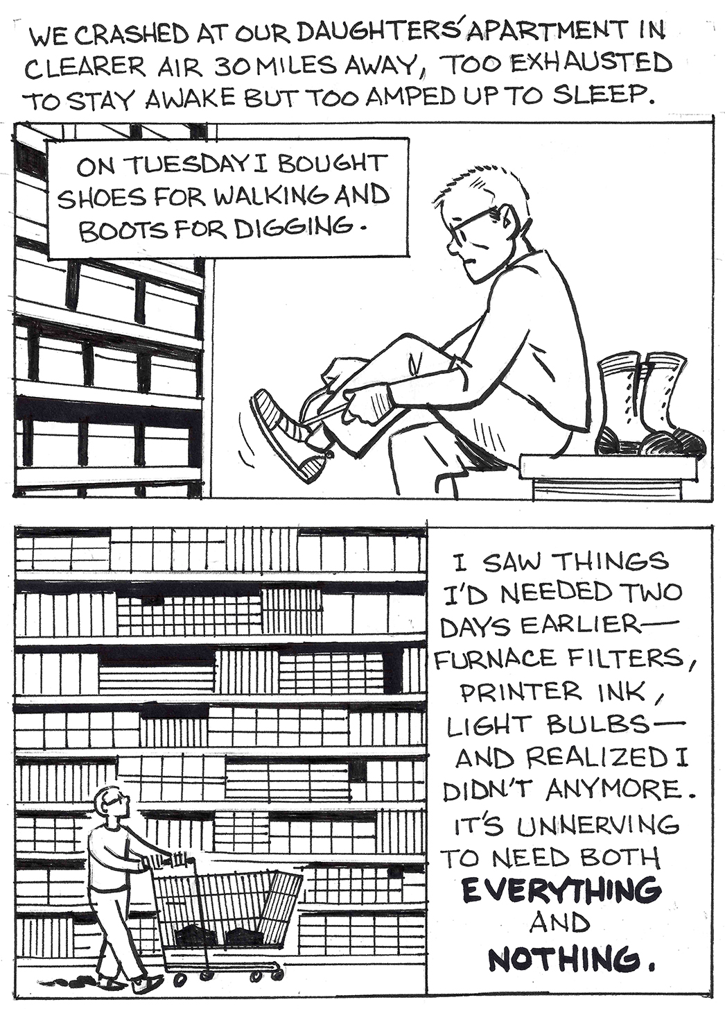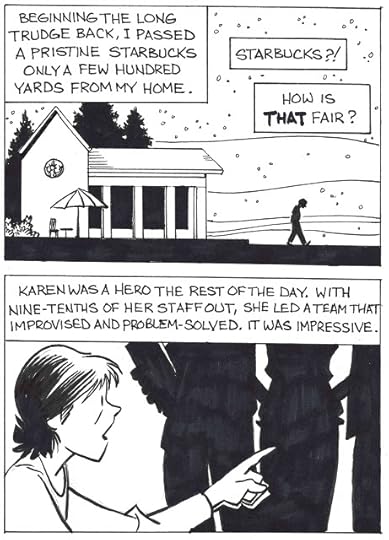 It's much less polished than my usual work, but that's part of the point. Writing, penciling and inking an 18-page comic like this would normally take me a few weeks. I did this over parts of four days using a bad brush pen and art supplies from Target--Sharpie pens, highlighters and crummy paper--because Target was the only open store I could find within 20 miles.