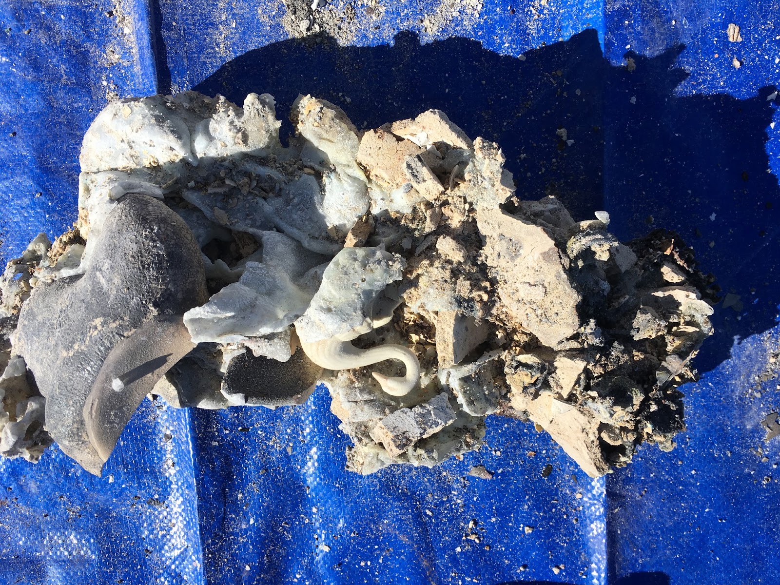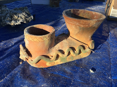 A surprising survivor: a relatively fragile terra cotta drum, formerly topped by leather drumheads. The fact that terra cotta came through OK makes sense, although many other fired ceramic pieces became very brittle and fell apart in our hands.