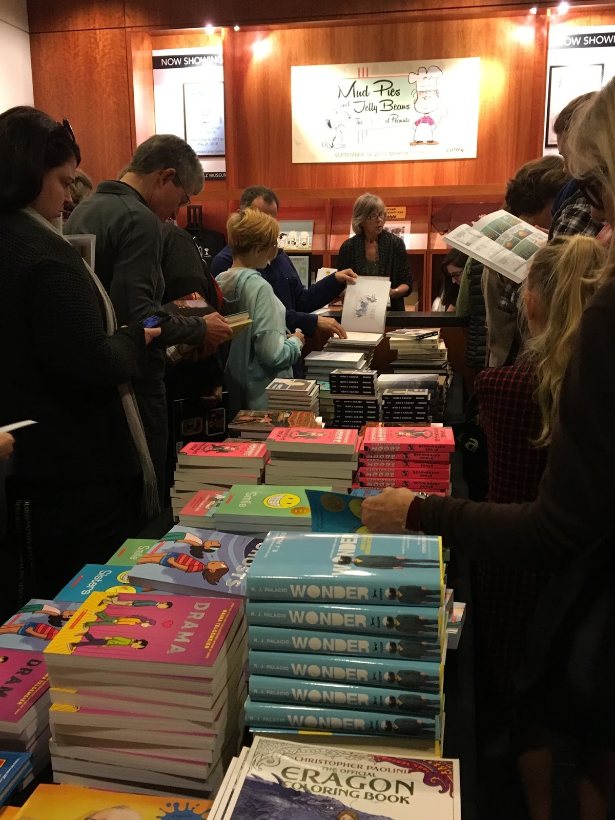 Other signing lines: From foreground right to background left, that's Raina Telgemeier, Judd Winick, Andrew Atteberry, and, standing, Dave Eggers talking to Jeannie Schulz.