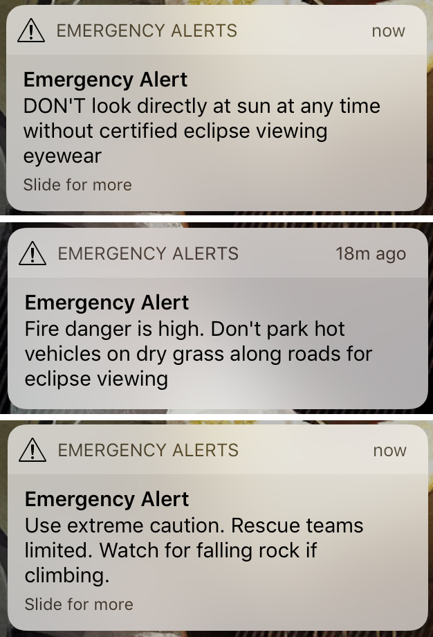 As totality approached, everyone's smart phones throughout the park began to chirp and bleat as officials broadcast emergency alerts. The last one is interesting: exactly how many rock climbers did the authorities expect to need rescuing during a two-minute eclipse?