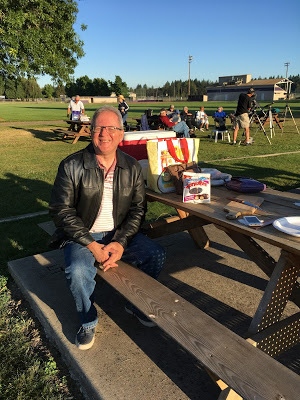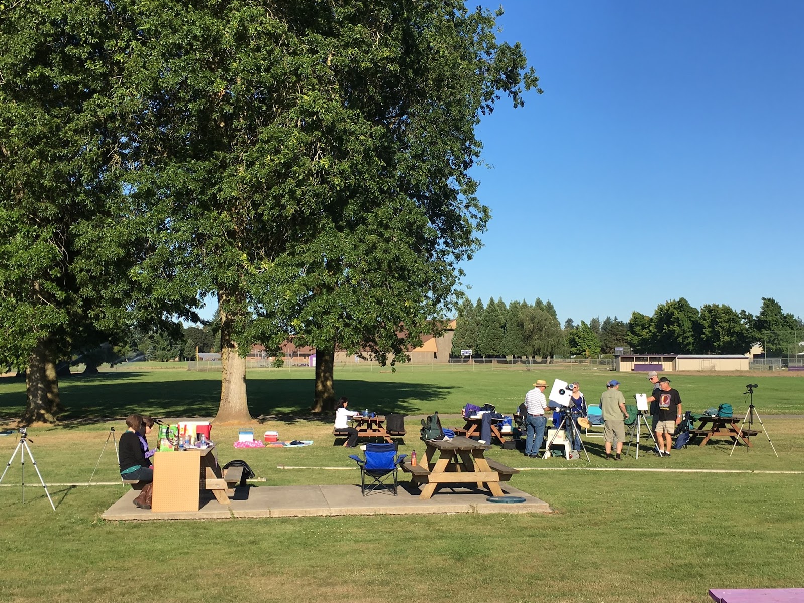 At our picnic table for breakfast, including a bag of little chocolate donuts, the Official Waxy Snack Cake of the 2017 Eclipse. That's the Science Gang behind us, and Jefferson High School in the far background. Lots of empty open space and blue skies!