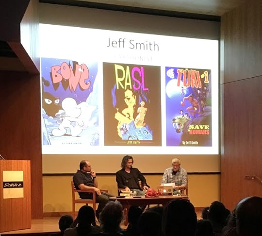 My friend Denis St. John from the Schulz Studio peddled his own work, promoted with his dazzling smile. Behind Denis in the hat is Astro City artist Brent Anderson. It's always nice to catch up with Brent and his wife Shirley, whom I usually run into at a local Farmers' Market because we live about six miles from each other.The event's guest of honor was Jeff Smith, creator of the hugely popular Bone series, now available in more than 30 languages worldwide. Jeff did an interview-style panel with the Schulz Studio's Paige Braddock and Lex Fajardo that covered pretty much all of his origin and career. Lex and Paige approached the job from different angles and managed to elicit answers Jeff probably hasn't given a hundred times before. It was a good panel, topped by Jeff being given the Cartoon Art Museum's "Sparky Award," named after Schulz for services to comics above and beyond the call of duty. Jeff seemed genuinely surprised and moved. It was a great moment.