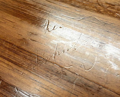 If you angle the light just right, you can see Mr. Schulz's lines and letters impressed into the soft wood of his drawing board. In fact, I think that reads "Schulz."