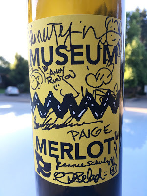 In addition to a variety of freshly fired pizzas and salads, the museum generously provided beverages, including bottles of "Museum Merlot" blended by Jeannie Schulz herself, according to the label on the back. I helped empty one and seized my opportunity, taking home what I'm pretty sure is the only wine bottle in the universe signed by (top to bottom) Raina Telgemeier, Andy Runton, Jeff Smith, Brent Anderson, Paige Braddock, Jeannie Schulz, Tom Beland and, sideways at lower right, Nathan Hale. I'm embarrassed to say how much I'll treasure this.There's a big part of me that'll always be 15 years old and amazed that not only do I know people who make comics professionally--some incredibly successfully--but that I get to do it, too. It's a lonely business and there aren't a lot of people you can talk shop with. Events like these are great fun and the public seems to get a lot out of them, too. Thanks to the Schulz Museum for letting me come play with my friends.