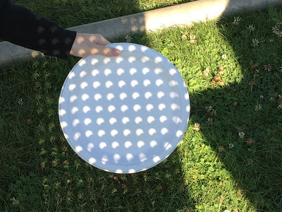 The hundreds of holes in a sheet of ordinary pegboard (or colander or anything with hundreds of little holes in it) act like pinhole camera lenses to project an upside-down image of the Sun. Here Laura holds the board while Robin finds a nice focal length with a paper plate screen.