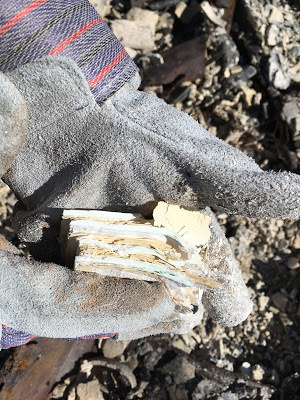 We found these Art Deco salt and paper shakers that belonged to Karen's grandmother sitting side by side straight up in the ashes. They barely look scorched. So far, this is our miracle recovery.