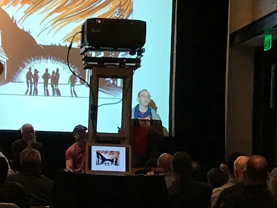 My friend Denis St. John from the Schulz Studio peddled his own work, armed with his dazzling smile. Behind Denis in the hat is Astro City artist Brent Anderson. It's always nice to catch up with Brent and his wife Shirley, whom I usually run into at a local Farmers' Market because we live about six miles from each other.The event's guest of honor was Jeff Smith, creator of the hugely popular Bone series, now available in more than 30 languages worldwide. Jeff did an interview-style panel with the Schulz Studio's Paige Braddock and Lex Fajardo that covered pretty much all of his origin and career. Lex and Paige approached the job from different angles and managed to elicit answers Jeff probably hasn't given a hundred times before. It was a good panel, topped by Jeff being given the Cartoon Art Museum's "Sparky Award," named after Schulz for services to comics above and beyond the call of duty. Jeff seemed genuinely surprised and moved. It was a great moment.