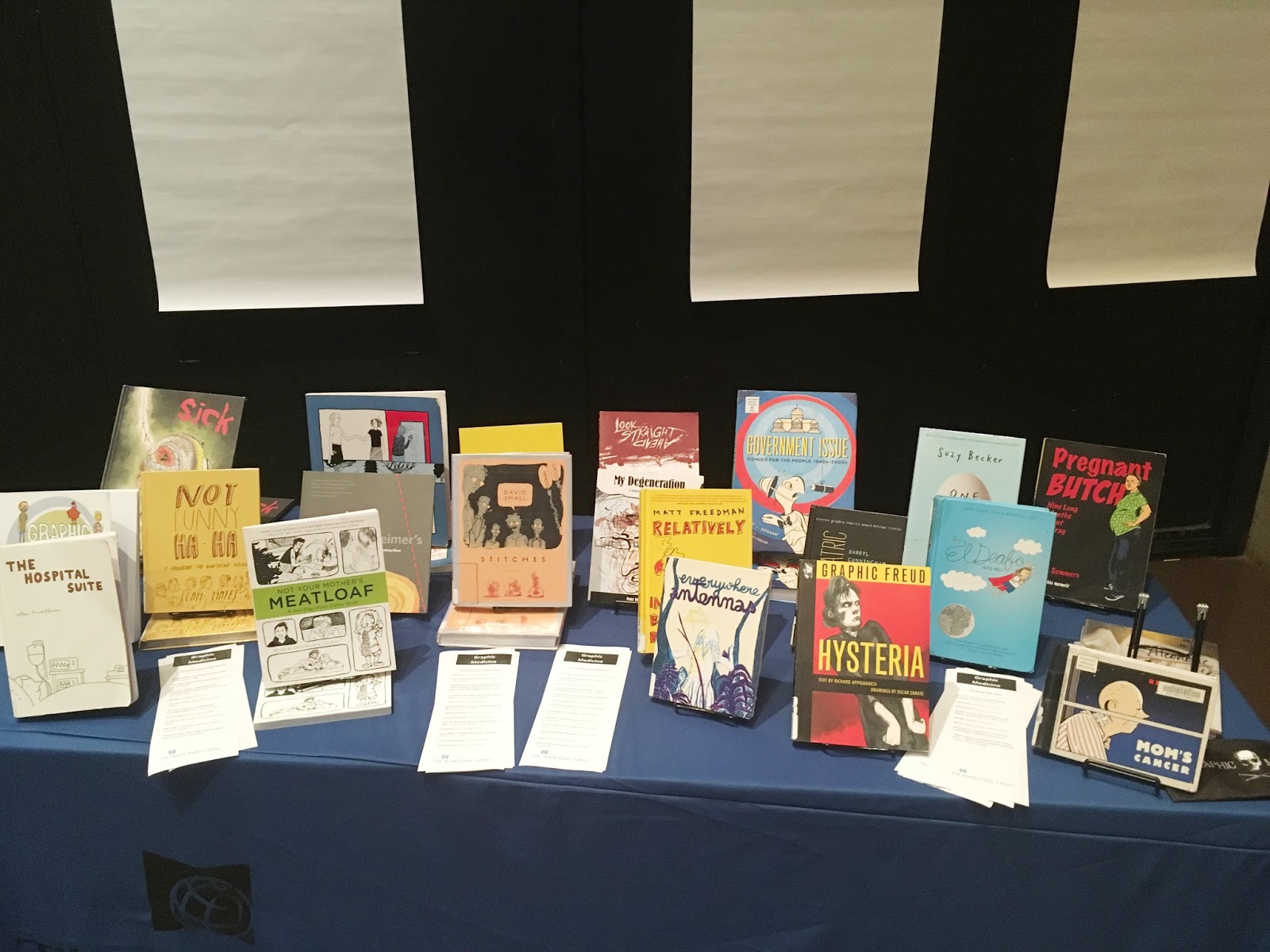 The Seattle Public Library pulled several GM comics from their shelves for display and browsing, and provided reading lists for dozens more. The white sheets of paper on the wall were taped up for people to draw on.