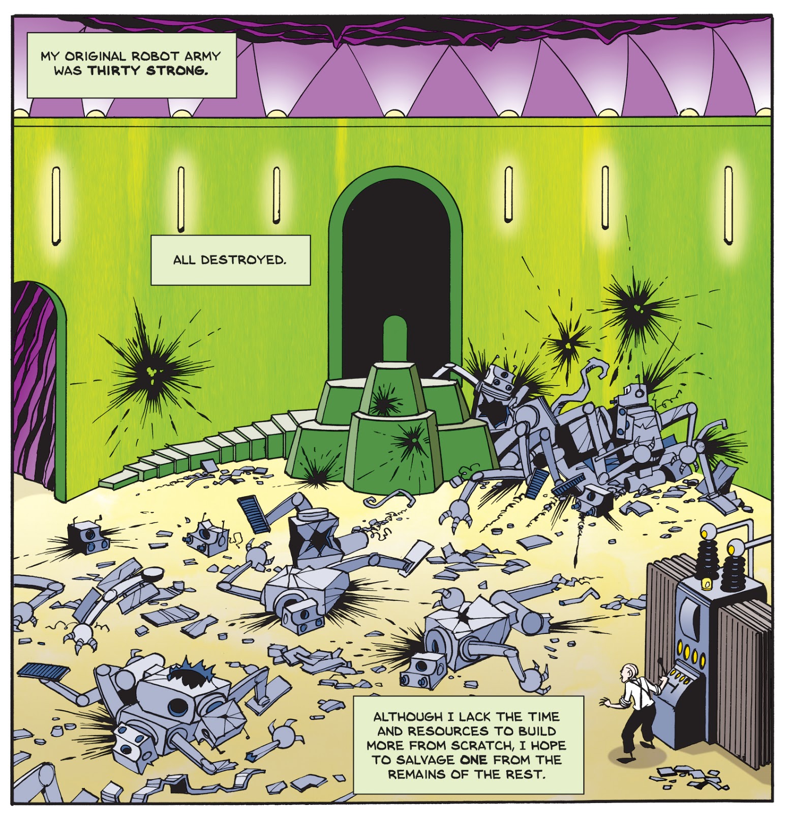 GoComics readers familiar with my original story will notice one change right away. My first version made no secret that it was a sequel to the great 1941 Fleischer Studios "Superman" cartoon titled "The Mechanical Monsters." Those shorts have long been in the public domain, so while I obviously couldn't use Superman in my new material, I felt legally and ethically free to retell the old cartoon's story in an opening preface. Well, my editor at Andrews McMeel Universal was understandably leery of that, so the comic starts with a new two-page preface scrubbed of anything Super. Honestly? I think it works better than the original.