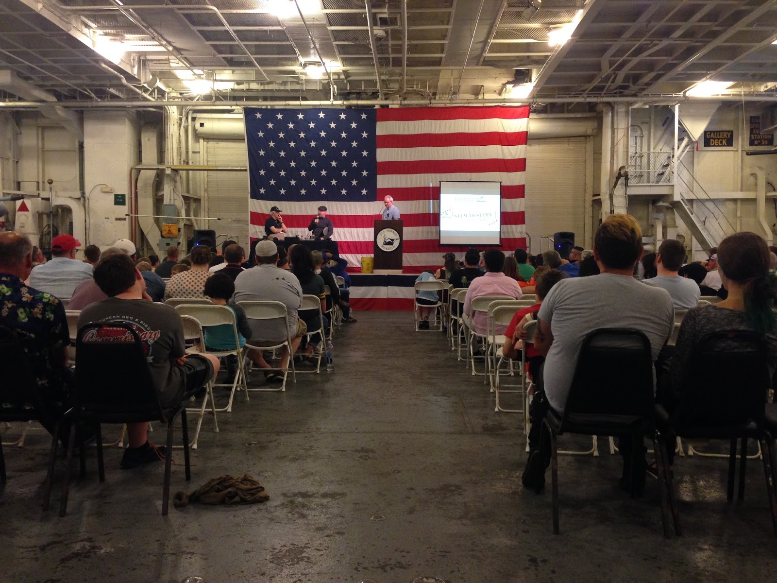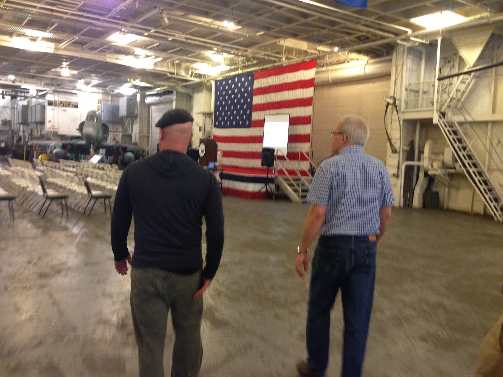 Me showing Jamie the venue and set-up. With its folding chairs, shared microphones and little projector screen, I think he thought it was cute.Jamie, Chuck, the Hornet staff and I exchanged e-mails for weeks in advance of the event, figuring out what it would be. The idea was "STEM to Stern: How an Aircraft Carrier Works," and we settled on taking broad scientific concepts like transforming potential energy to kinetic energy, asking Jamie about his real-world experience air-dropping dummies and crashing trucks, and explaining how the concepts applied on the Hornet, e.g., catapulting airplanes off the flight deck. I prepared about three times as much material as I knew we'd use, Chuck prepared about five times as much, and Jamie showed up and told great stories.
