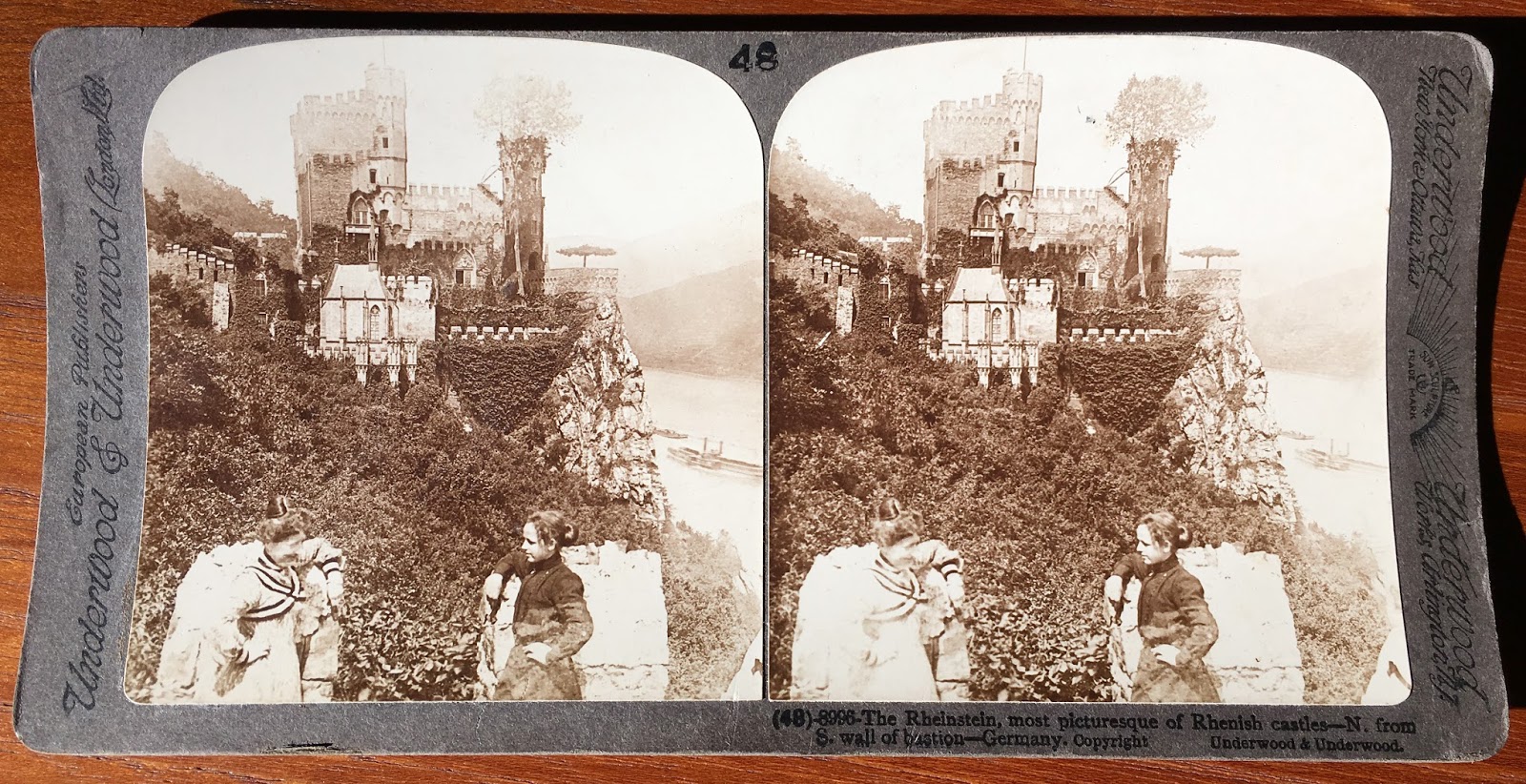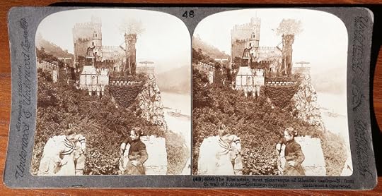 I especially like stereographs of places I've been. It's fun (and a little spooky) to compare my modern experience of a place to that of someone a century ago. At an antiques fair yesterday, I found a card of Rheinstein Castle; since Karen and I just took a cruise up the Rhine River, I had to bring the card home and check whether we'd seen that castle ourselves.