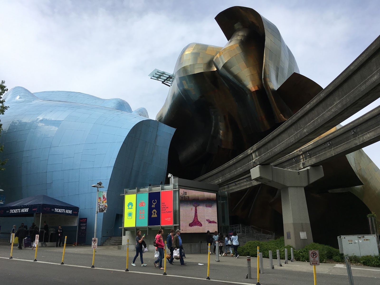 The monorail track ends in this Frank Gehry building that houses the MoPOP.