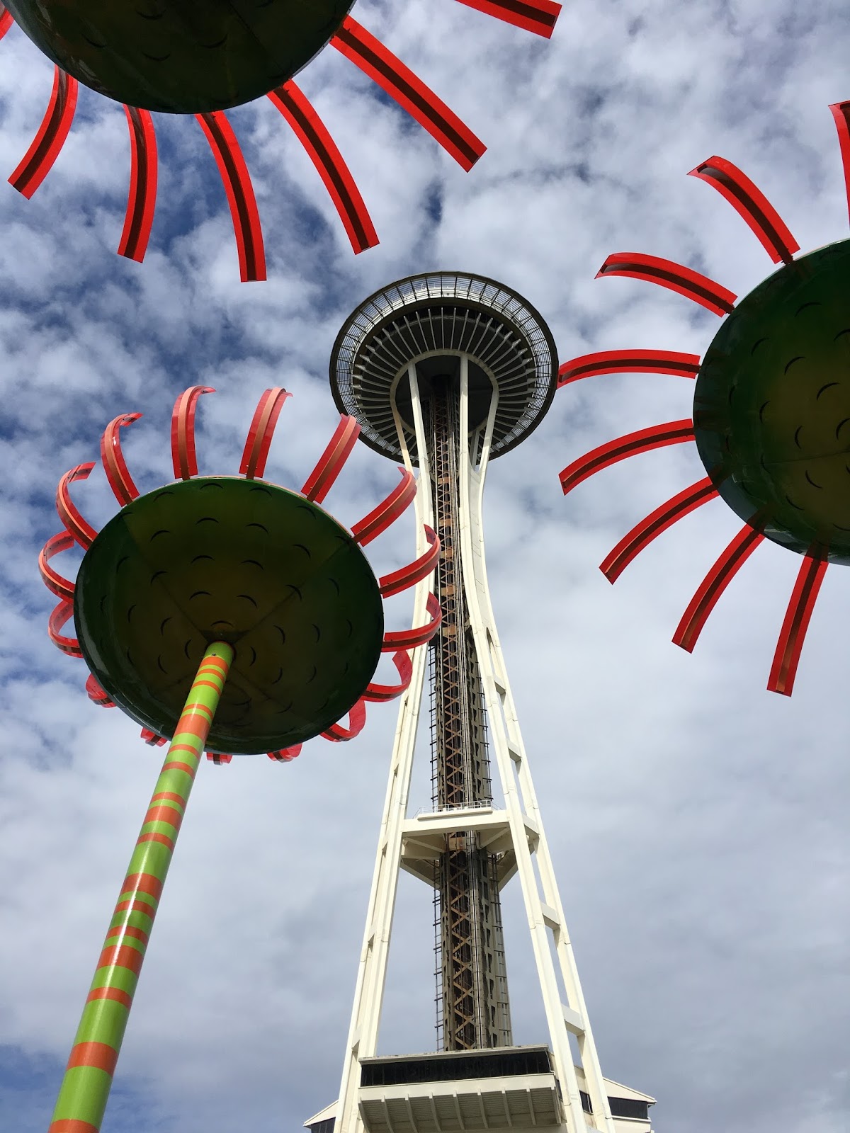 An angle on the Space Needle shot through some floral metal sculptures (hard to tell from this angle, but the flowers are about the height of light posts).