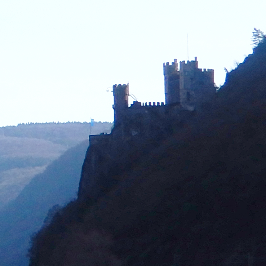 There, that hulking silhouette on the right bank.It's distant and dark, and unfortunately the only picture of this castle I got. Cropping and fiddling in Photoshop brings out a few more details that make it a definite match.